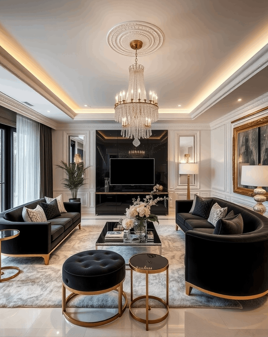 • גופי תאורה: מאפיין מרכזי נוסף של עיצוב פנים גלאם הוא גופי תאורה המושכים את העין כמו אהילים מתכתיים, נברשות קריסטל מפוארות ותאורת סביבה נוצצת.