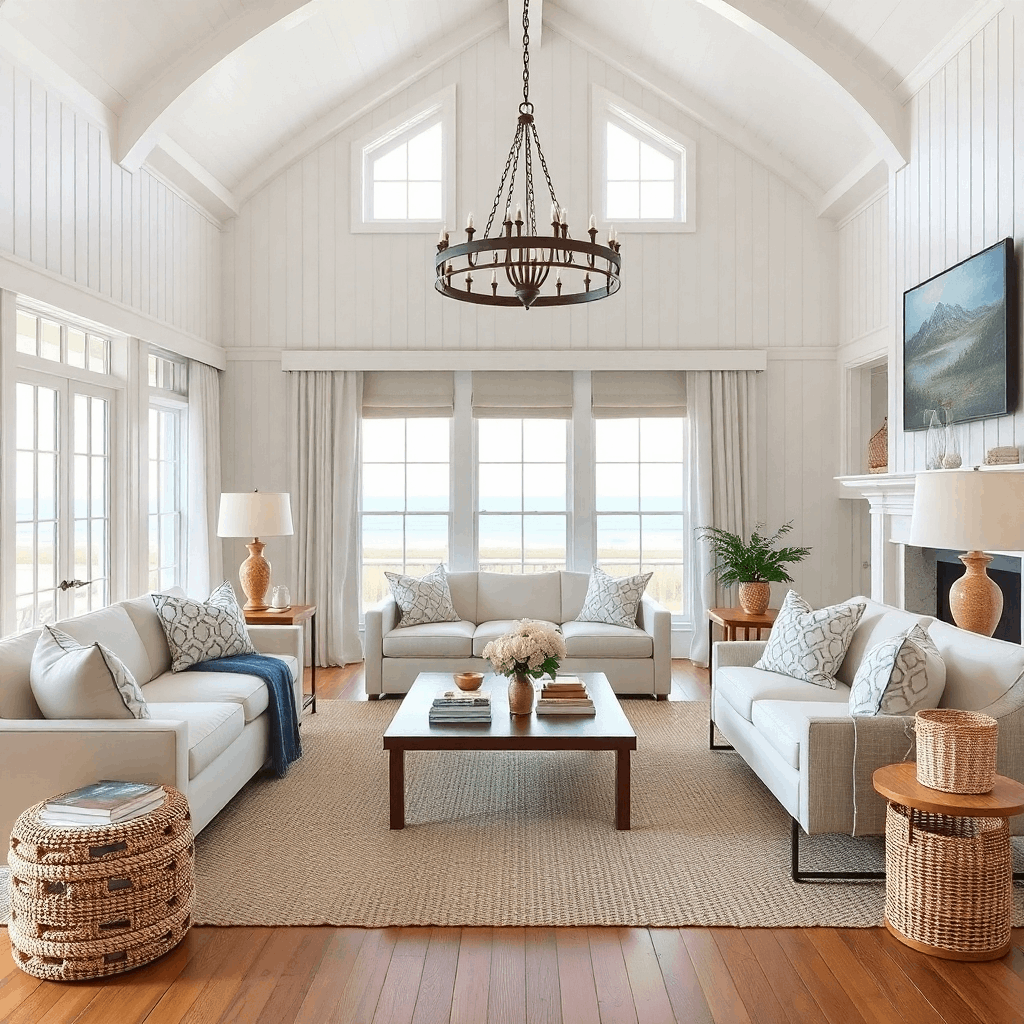 אביזרים : וילונות נשפכים מוסיפים תחושה קלילה ונועזת על חוף הים לאזורי המגורים בסגנון המפטון. שטיחי יוטה או סיסל גדולים, סלסלות ארוגות גדולות, פסלי אלמוגים אלגנטיים, קונכיות גדולות והדפסים איכותיים בנושא חוף. קרמיקה בגווני נייבי ולבן, פריטי ימי וינטג' ופסים עדינים בכחול ולבן מציעים קריצה בטוב טעם לנושא הימי מבלי להיות קיטש. - צבעים: פלטת הצבעים בסגנון המפטון כוללת לבן נייטרלי ודגשים בצבעי אפור מושתק, בז' חם, נייבי, נייטרליים רכים כמו לבן, שמנת ובז' עבור קירות ופריטי ריהוט גדולים כדי ליצור תחושה בהירה ופתוחה כבסיס. גוונים של כחול, מכחול כהה עד כחול שמיים רך, המשקפים את האוקיינוס והשמים. הדגשים של ירוקים רכים, אפורים וגוונים חוליים כדי להכניס את צבעי הנוף הטבעי. גווני עץ שחורים או כהים להוספת ניגודיות ועומק ללוח האור.