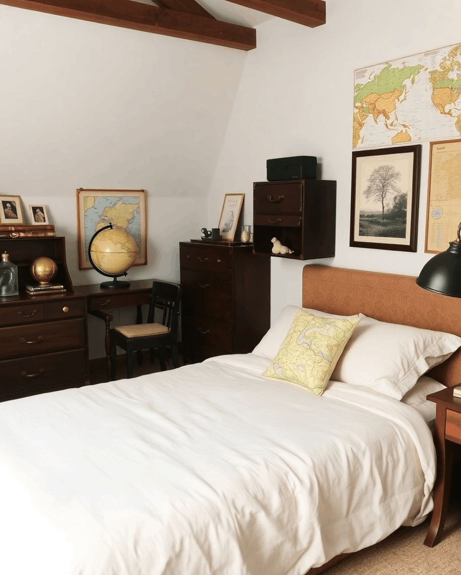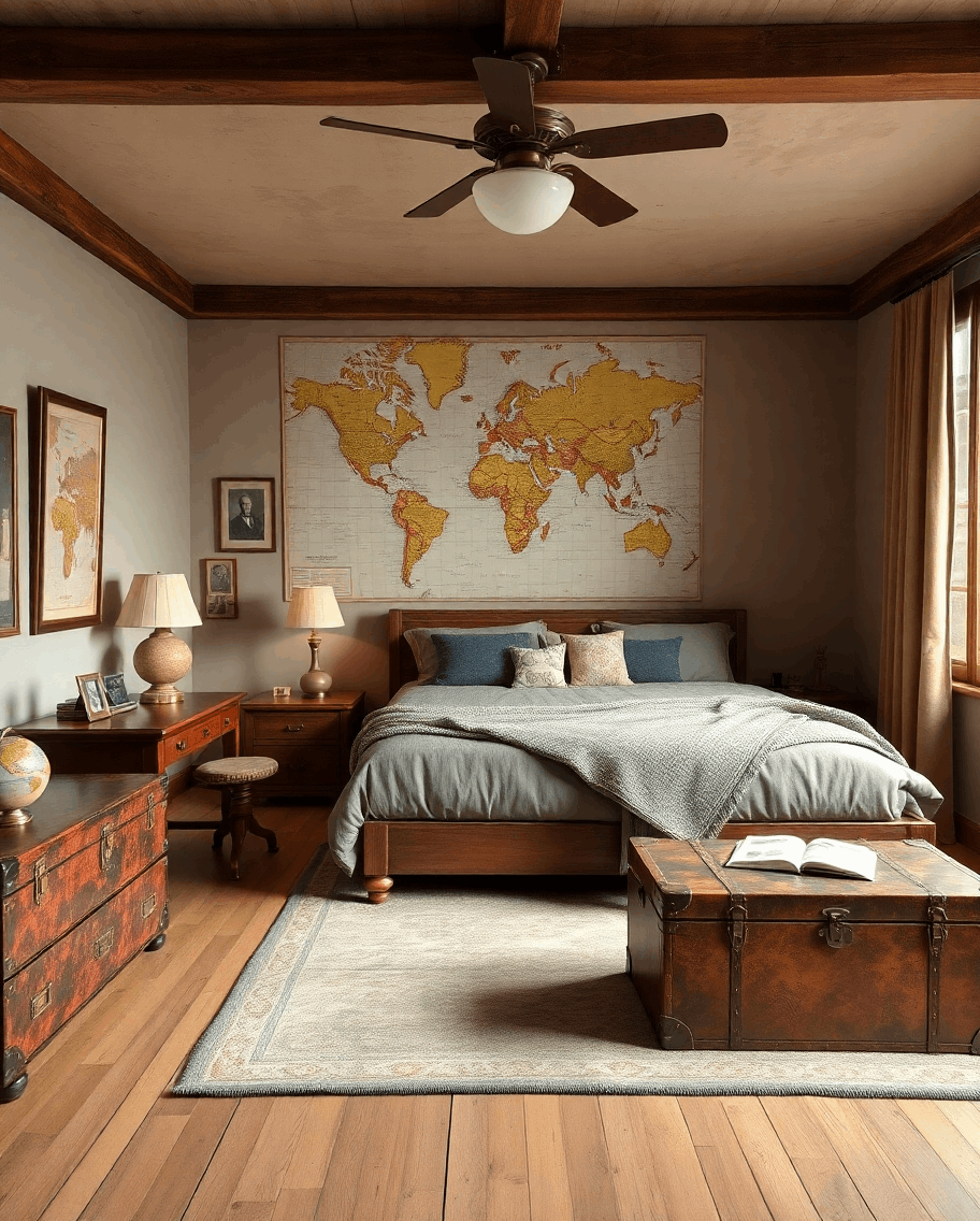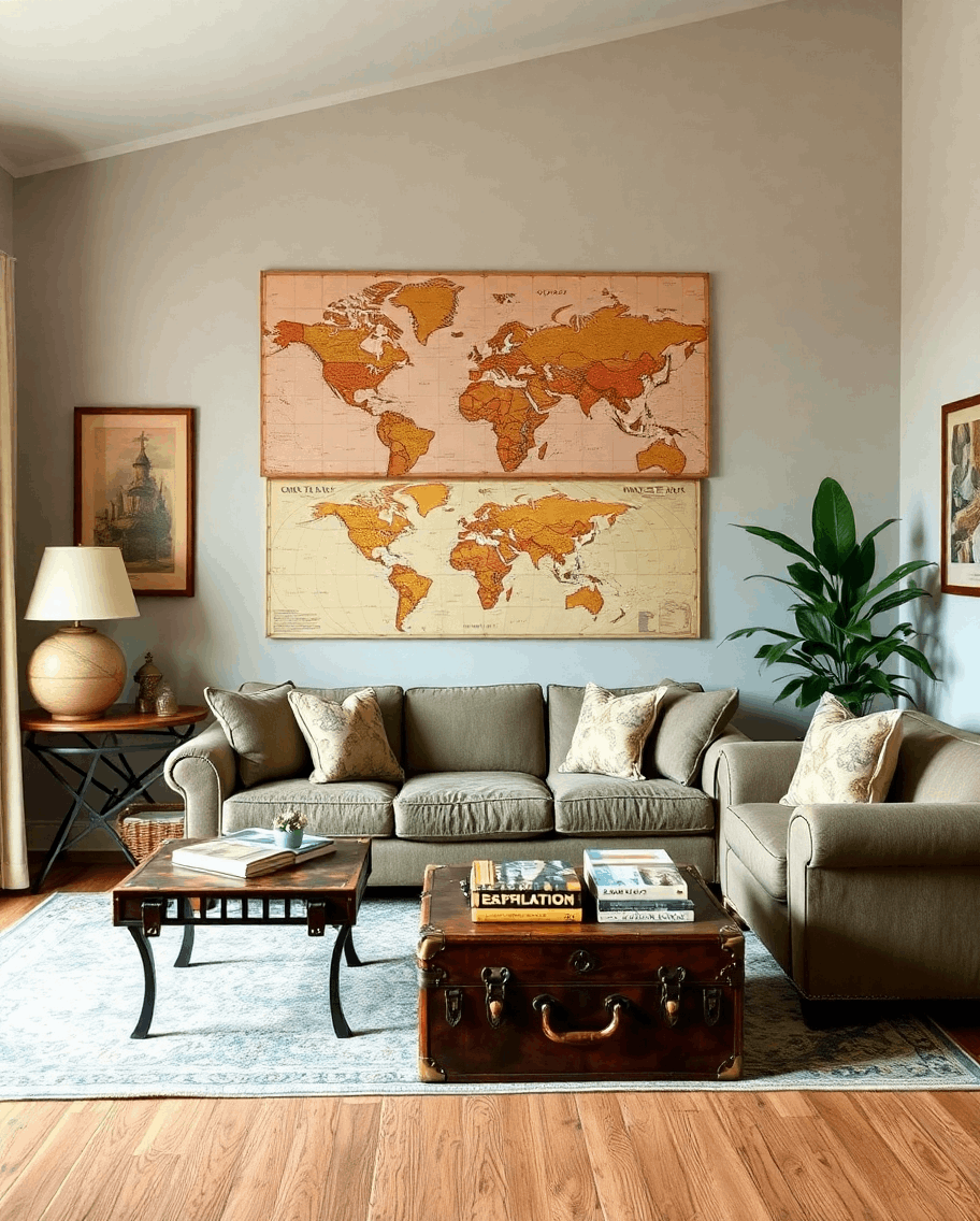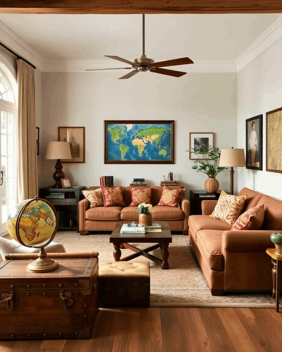 • אביזרים: מפות ותרשימים משמשים לעתים קרובות ככלי קישוט עם כדורי וינטג' שמלבישים שולחנות קפה ומפות ממוסגרות תלויות על הקירות.  פריטים עתיקים כמו מזוודות ישנות, ארגזים ותכשיטים עולמיים, גלויות שניתן למסגר או לקבץ אותן יחד בקולאז' לגלריית קיר ייחודית.