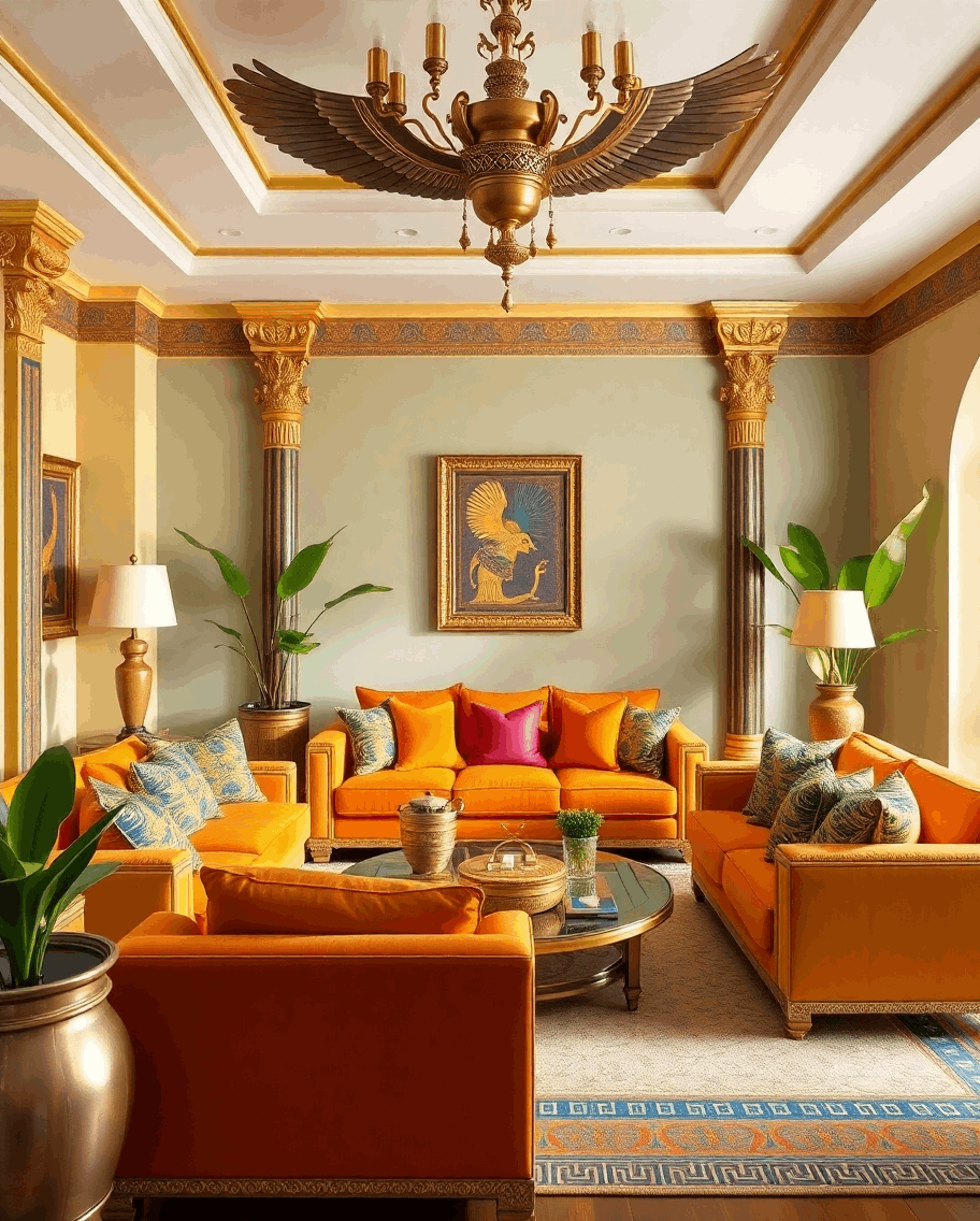 • מאפיינים מרכזיים: הקפדה על הדר ופרטים מורכבים. גיאומטריה היא אחד המרכיבים המרכזיים של עיצוב פנים מצרי, סימטריה ומידתיות היו בשימוש של המצרים הקדמונים. האסתטיקה חשובה אבל הכל עוסק במציאת משמעויות סמליות ונרטיבים תרבותיים עשירים. השימוש בהירוגליפים ובאלמנטים מצריים אחרים הוא די פופולרי.