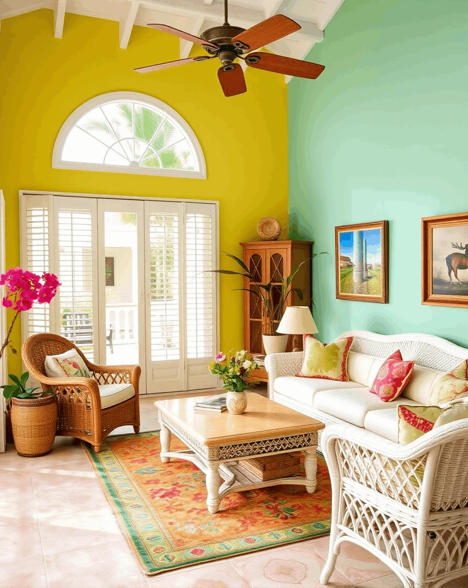 - צבעים: הצבעים הרלוונטיים לעיצובי פנים בקריביים יכולים לכלול קלמנטינה, צהוב כנרי, אקווה, צהבהב, טורקיז, אלמוגים, ליים או היביסקוס. מלבד השימוש בצבעים עזים ותוססים, , הצבעים לרוב אינם תואמים או משלימים. עיצוב פנים עשוי לכלול צהוב, כחול, כתום ופוקסיה, כולם באותו חלל.