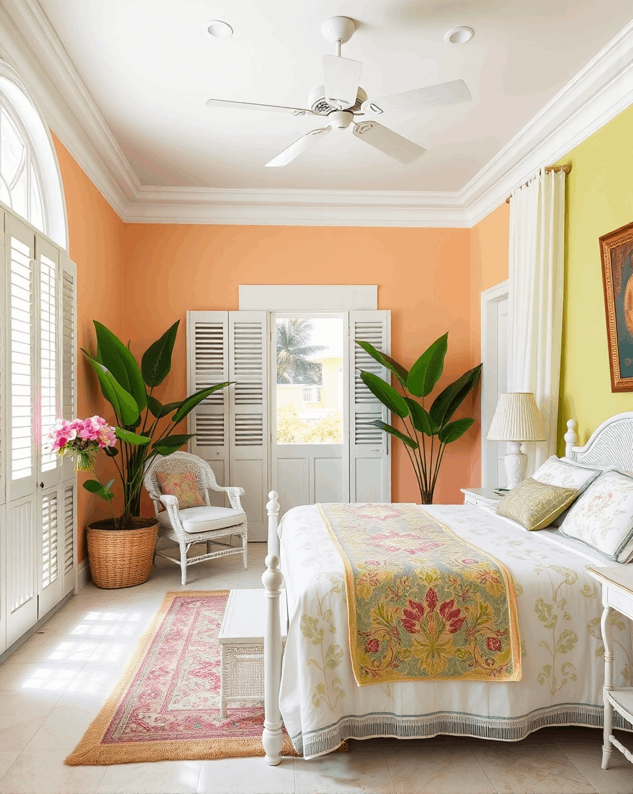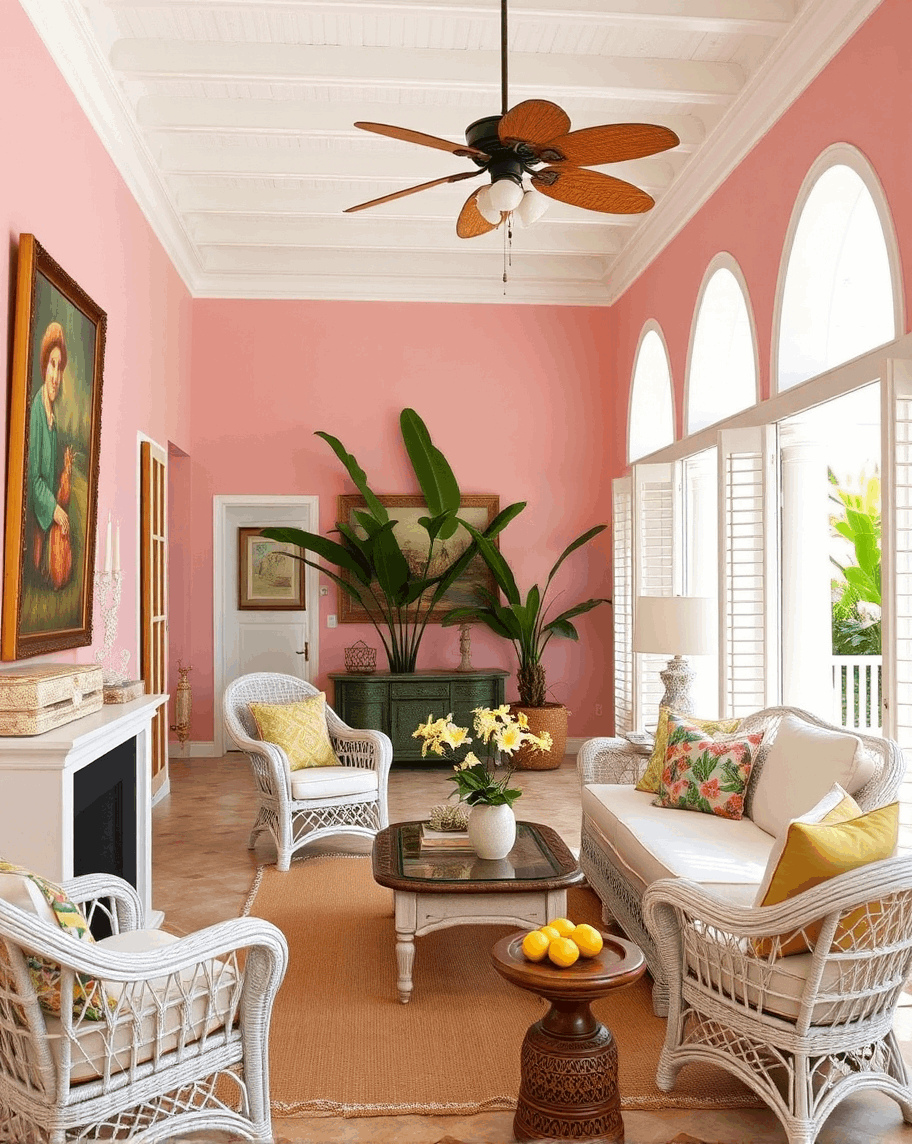 - מאפיינים מרכזיים: מבנים קולוניאליים בגווני פסטל, מעברים מקושתים, מרפסות עץ רחבות עם תריסים וחצרות פנימיות. לעתים קרובות תקרות גבוהות, חלונות גדולים ודלתות הנפתחות לרווחה. דגש על אלמנטים טבעיים בבתים הקריביים, פרחים וצמחים טריים. רהיטי ראטן וקש, צבעים נועזים ויצירות מקומיות בעבודת יד, רהיטים או כלי חרס וטקסטיל ארוגים.