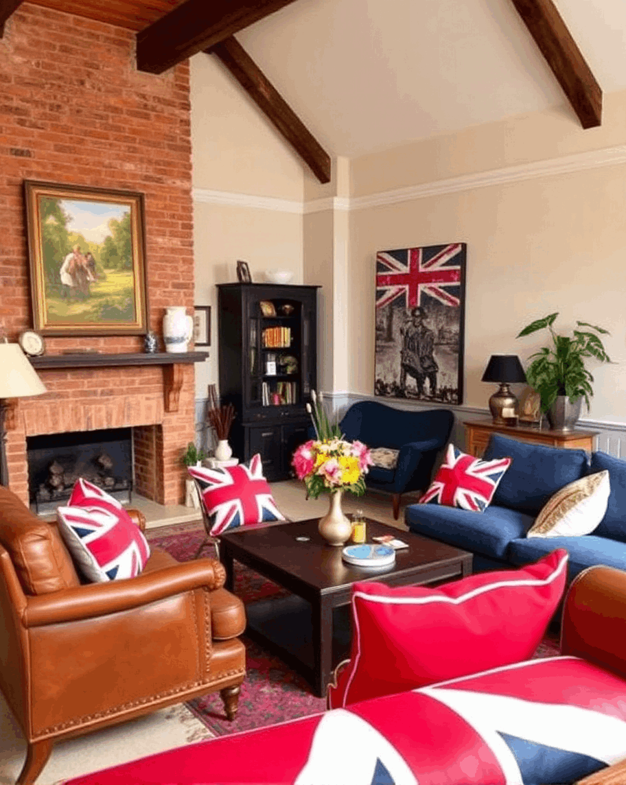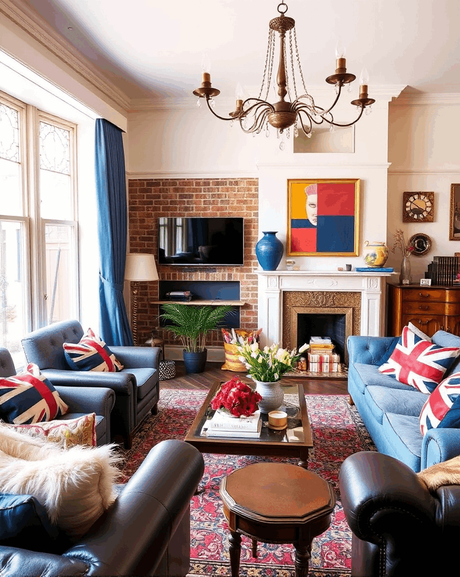 - מאפיינים מרכזיים: גאווה בבריטניה, ולכן הדגל הבריטי משמש לעתים קרובות כהשראה עיצובית, למשל, אח לבנים חמות, קירות בצבע שמנת וספות בגוון כחול.